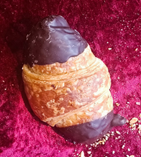 Ein Croissant aus Weizenmehl und Butter, das mit Nougatcreme gefüllt ist. Dekoriert ist das Croissant mit kakaohaltiger Fettglasur.